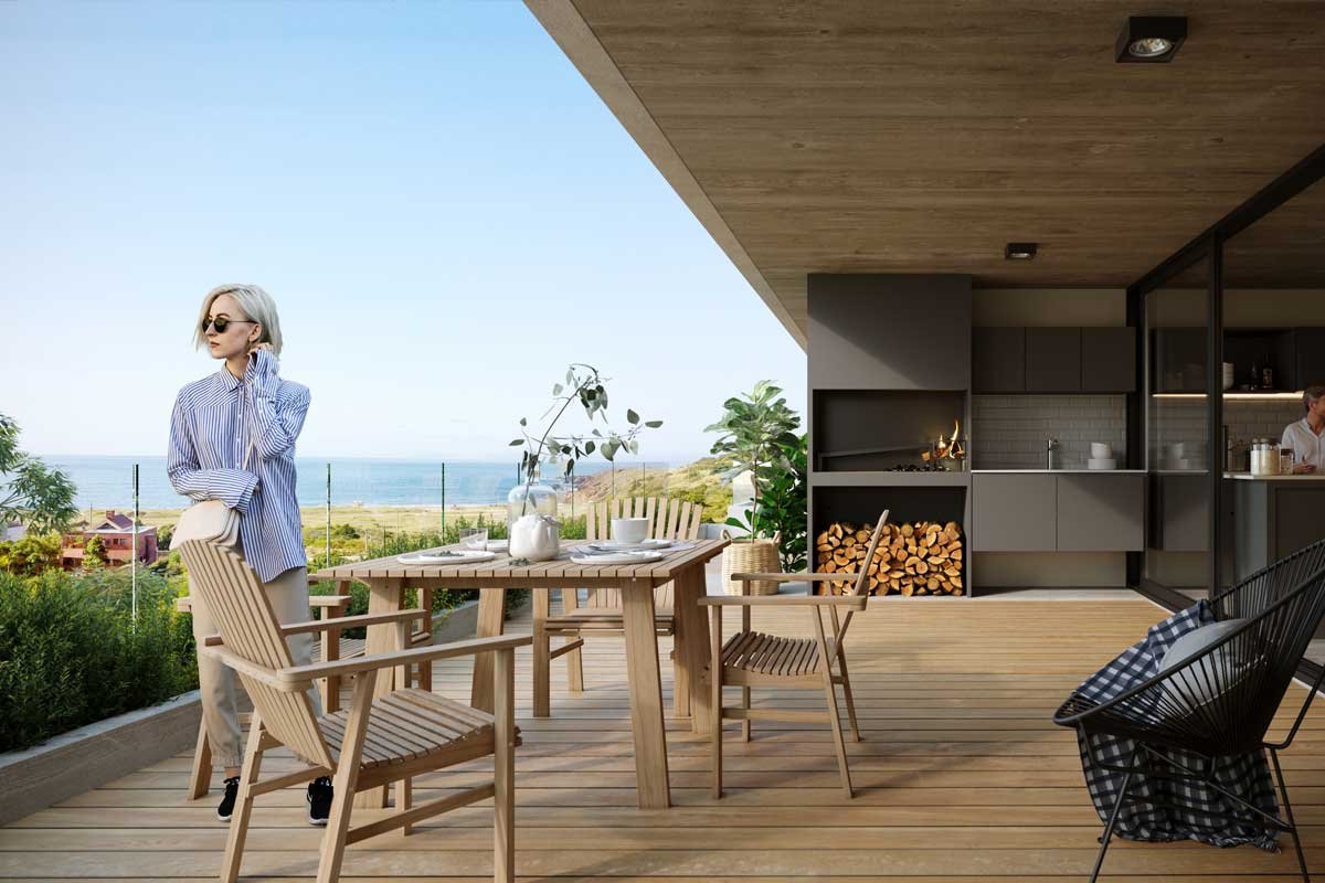 Todas sus unidades, disponibles de 2 dormitorios, dan a estas amplias terrazas ajardinadas con vistas a la bahía esteña y otras con vista a la loma de la ballena, donde uno puede relajarse, tomar sol o hacer un asado entre amigos gracias a que cada vivienda cuenta con su propio parrillero.